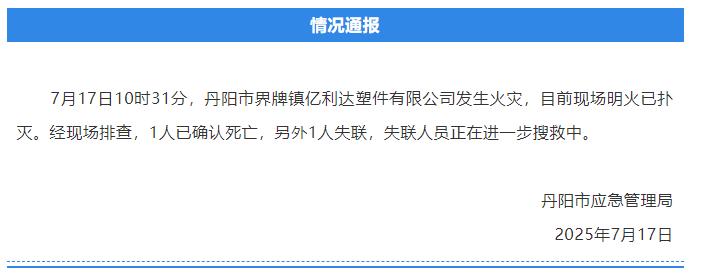 事發(fā)當(dāng)日21時(shí)許,丹陽市應(yīng)急管理局發(fā)布通報(bào)稱,事故現(xiàn)場明火已及時(shí)撲滅。經(jīng)排查,事故造成1人死亡,另有1人失聯(lián)。