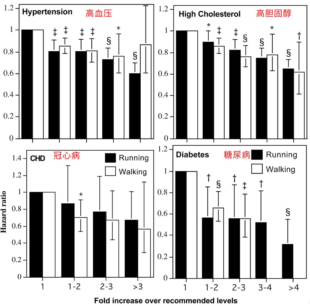 研究表明,每增加1 MET(代謝當(dāng)量)的能耗,跑步與走路在降低糖尿病和CHD風(fēng)險(xiǎn)上無顯著差異,但走路在降低高血壓和高膽固醇血癥風(fēng)險(xiǎn)上略高于跑步。