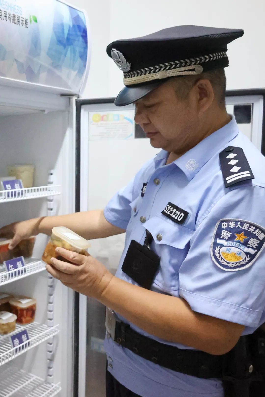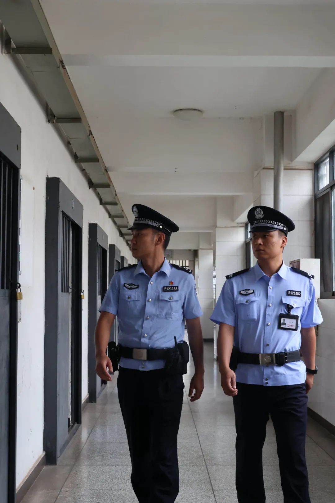 破曉微光,藏藍(lán)制服下有著獨(dú)特的溫度感知。配餐中心操作間已透出微光,新老民警在晨昏線上擦肩,警徽下映出相同的藏藍(lán)底色。昨夜被汗水浸透的警服領(lǐng)口,又承接著今日第一縷暑氣。高墻沒有黑夜。