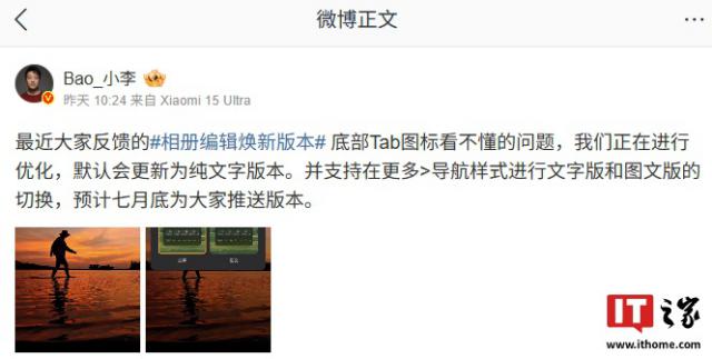 IT之家注意到,小米相機(jī)部的產(chǎn)品經(jīng)理 @Bao_ 小李昨日發(fā)文回應(yīng)了“相冊編輯煥新版本底部Tab圖標(biāo)看不懂”的問題,稱正在進(jìn)行優(yōu)化,默認(rèn)會更新為純文字版本,并支持在更多 > 導(dǎo)航樣式進(jìn)行文字版和圖文版的切換,預(yù)計(jì)7月底推送版本。