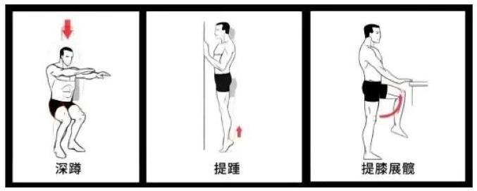 深蹲:模仿坐椅子動作,膝蓋不超過腳尖;