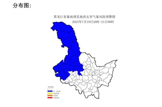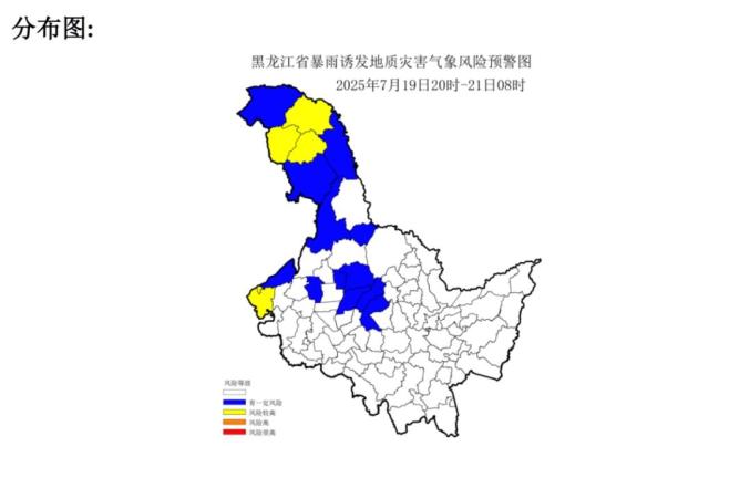 預(yù)計(jì)7月19日夜間至21日08時(shí),大興安嶺全區(qū)、嫩江、愛輝、訥河、龍江、甘南、碾子山有較高氣象風(fēng)險(xiǎn)引發(fā)山洪災(zāi)害(黃色預(yù)警);五大連池、北安、孫吳、齊齊哈爾、克山、克東、拜泉、海倫、綏棱、慶安有一定風(fēng)險(xiǎn)發(fā)生山洪災(zāi)害(藍(lán)色預(yù)警)。