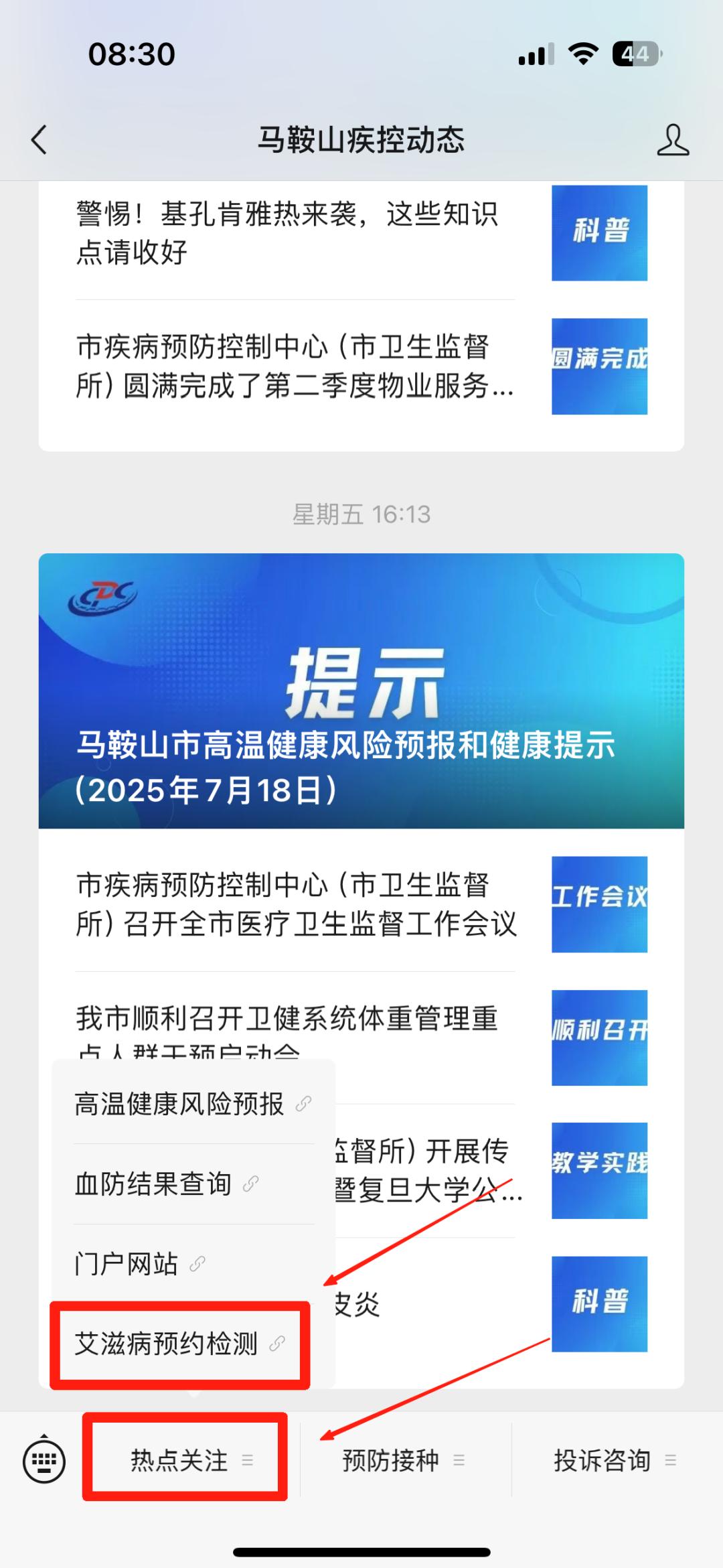 1. 關(guān)注‘馬鞍山疾控動(dòng)態(tài)’微信公眾號(hào),點(diǎn)擊菜單‘服務(wù)’,進(jìn)入‘熱點(diǎn)關(guān)注’,再點(diǎn)擊‘艾滋病預(yù)約檢測(cè)’;