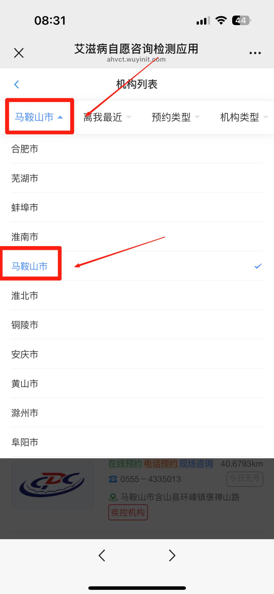 2. 進(jìn)入頁(yè)面后選擇‘預(yù)約HIV檢測(cè)’,然后選定‘馬鞍山市’,可查看檢測(cè)機(jī)構(gòu)列表(含市疾控中心,和縣、含山縣、當(dāng)涂縣疾控中心),選擇機(jī)構(gòu)后按提示登錄并點(diǎn)擊‘立即預(yù)約’;
