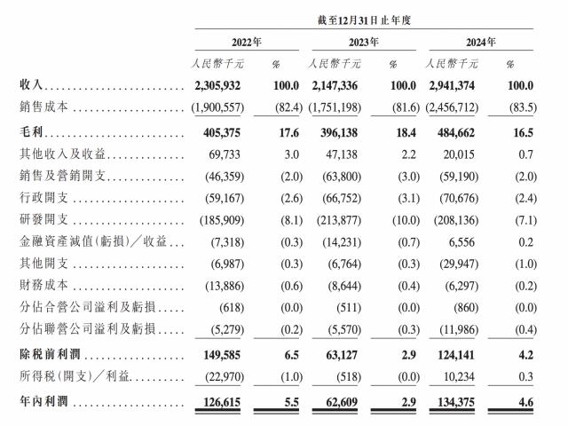 2022 - 2024年,美格智能的收入分別為23.06億元、21.47億元、29.41億元,年內(nèi)利潤(rùn)分別為1.27億元、0.63億元、1.34億元,毛利率分別為17.6%、18.4%及16.5%。