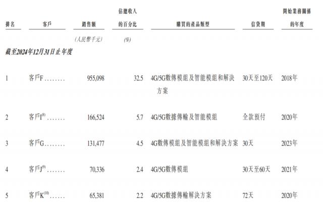 報(bào)告期內(nèi),美格智能前五大客戶結(jié)構(gòu)出現(xiàn)明顯變化。與2022年相比,2024年前五大客戶完全洗牌。其中,2023年和2024年的最大客戶“客戶F”十分引人注目,分別為美格智能帶來5.22億元、9.55億元的銷售收入,占總收入的比例分別為24.3%、32.5%。