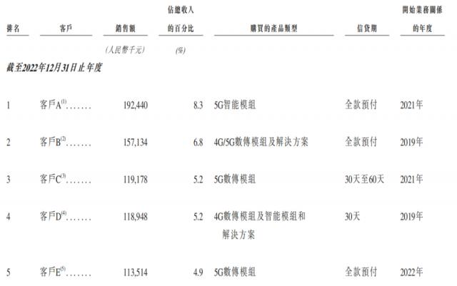 而在2022年,美格智能來自第一大客戶“客戶A”的收入占比僅為8.3%,前五大客戶收入總和為7.0億元,占總營(yíng)收的30.4%,且當(dāng)年的前五大客戶均未出現(xiàn)在2024年前五大客戶名單中。
