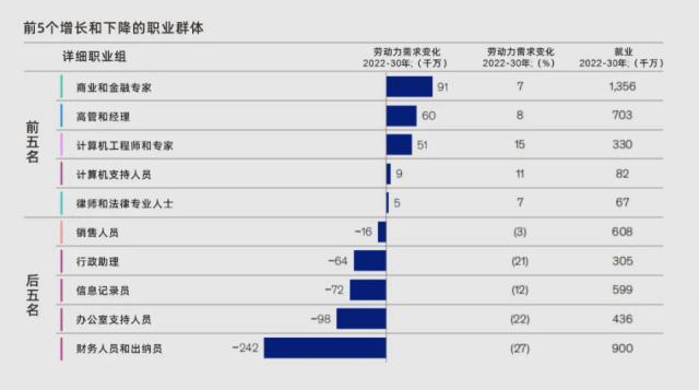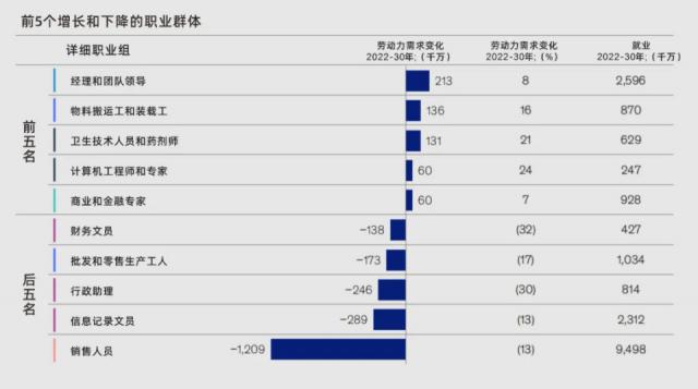 批發(fā)零售和制造業(yè)受影響大。到2030年,預(yù)計(jì)分別有280萬(wàn)和210萬(wàn)人需重新?lián)駱I(yè)。批發(fā)零售業(yè)中,自動(dòng)售貨機(jī)等重構(gòu)流程,收銀員等崗位將被替代,而經(jīng)理類等職業(yè)需求增長(zhǎng)。制造業(yè)中,一線基礎(chǔ)技能崗如生產(chǎn)工人等將被取代,工程師等人才需求增加。