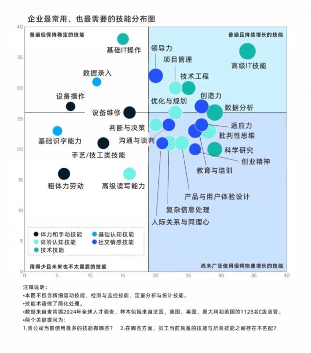 《AI 2027》報(bào)告指出,未來(lái)稀缺人才是通感者——復(fù)合型人才。AI浪潮下,更看重職業(yè)技能。麥肯錫報(bào)告提到,未來(lái)職場(chǎng)崗位將重新定義和分配,與技術(shù)技能、社會(huì)情感技能、體力和手動(dòng)技能、高階認(rèn)知技能、基礎(chǔ)認(rèn)知技能五大就業(yè)技能相關(guān)。