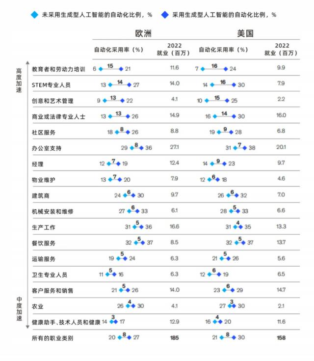 職業(yè)消亡是有規(guī)律推進(jìn)的。麥肯錫報(bào)告指出,2030年,美國(guó)30%崗位、歐洲27%崗位將受生成式AI影響,職業(yè)轉(zhuǎn)型加速約10年。