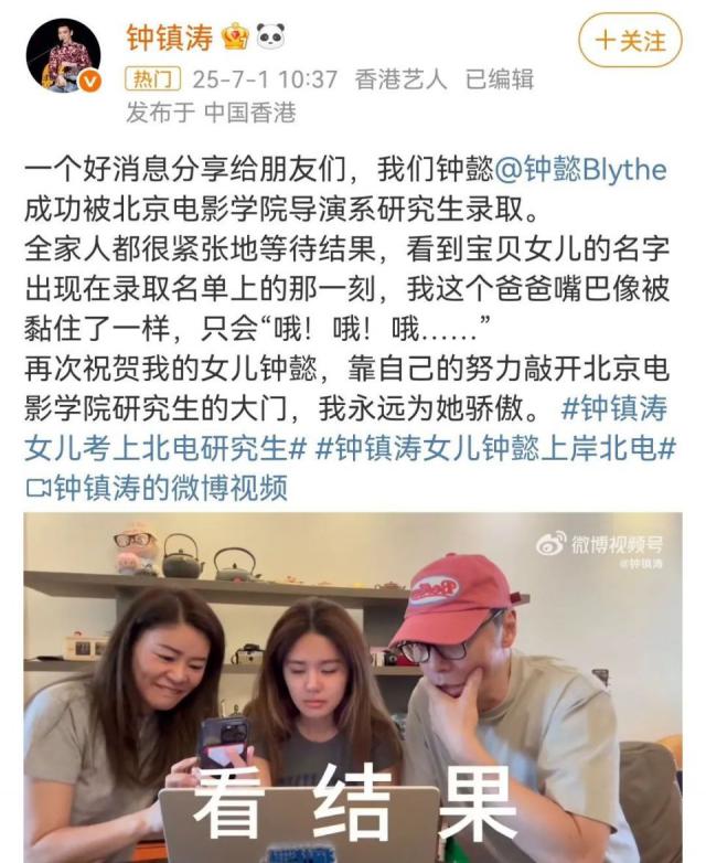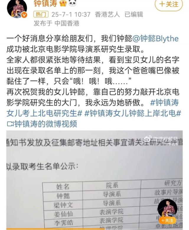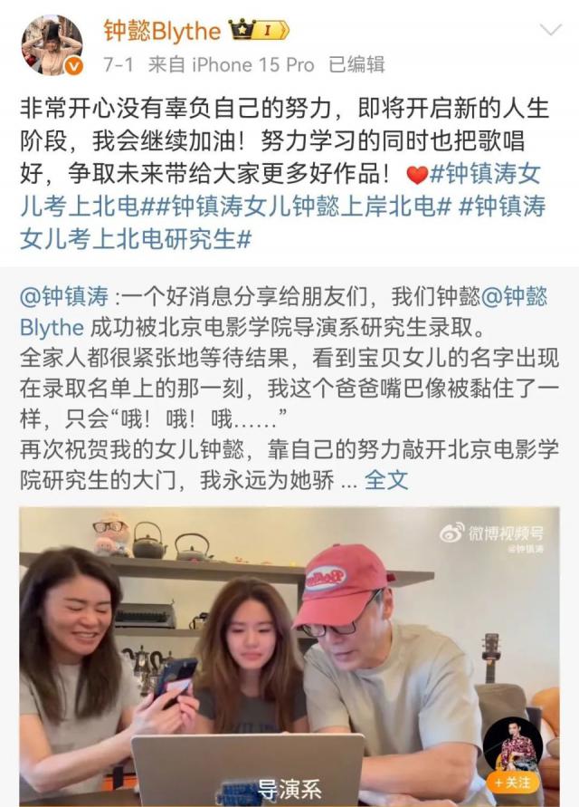 5月底,鐘懿成功查詢到自己被北電導(dǎo)演系錄取的消息。7月1日,72歲的鐘鎮(zhèn)濤按捺不住內(nèi)心的喜悅,在個(gè)人微博上跟網(wǎng)友分享了這個(gè)好消息。