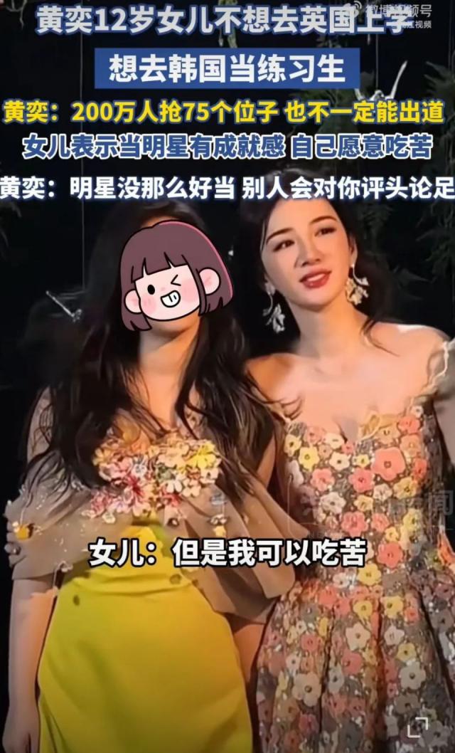 近日,演員黃奕發(fā)視頻分享,12歲的女兒黃芊玲不想去英國(guó)上學(xué),想進(jìn)娛樂(lè)圈,想去韓國(guó)當(dāng)練習(xí)生。黃奕表示明星不好當(dāng),會(huì)被人評(píng)頭論足,去韓國(guó)SM公司當(dāng)練習(xí)生,“200萬(wàn)人搶75個(gè)位置”,可能練習(xí)幾萬(wàn)小時(shí)也不一定能出道。