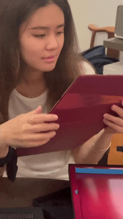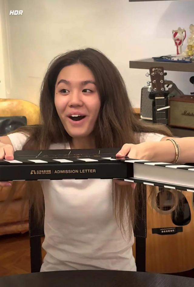 在開(kāi)箱視頻中,鐘懿小心翼翼地拆開(kāi)外包裝,當(dāng)拿出設(shè)計(jì)成場(chǎng)記板造型的錄取通知書時(shí),她驚喜地發(fā)出一聲“哇哦”。一旁錄視頻的父親鐘鎮(zhèn)濤也跟著女兒驚嘆,夸贊錄取通知書很酷。