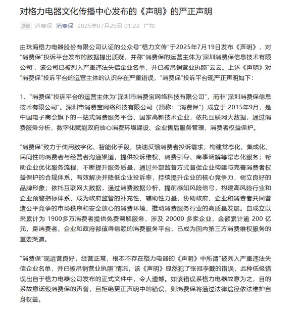 格力的聲明迅速引發(fā)廣泛關(guān)注。隨后,“消費?!痹?7 月 20 日凌晨發(fā)表長文回應(yīng),稱目前自身運營狀況良好,不存在格力所說的被列入嚴(yán)重違法失信企業(yè)名單或已被吊銷營業(yè)執(zhí)照的情況。