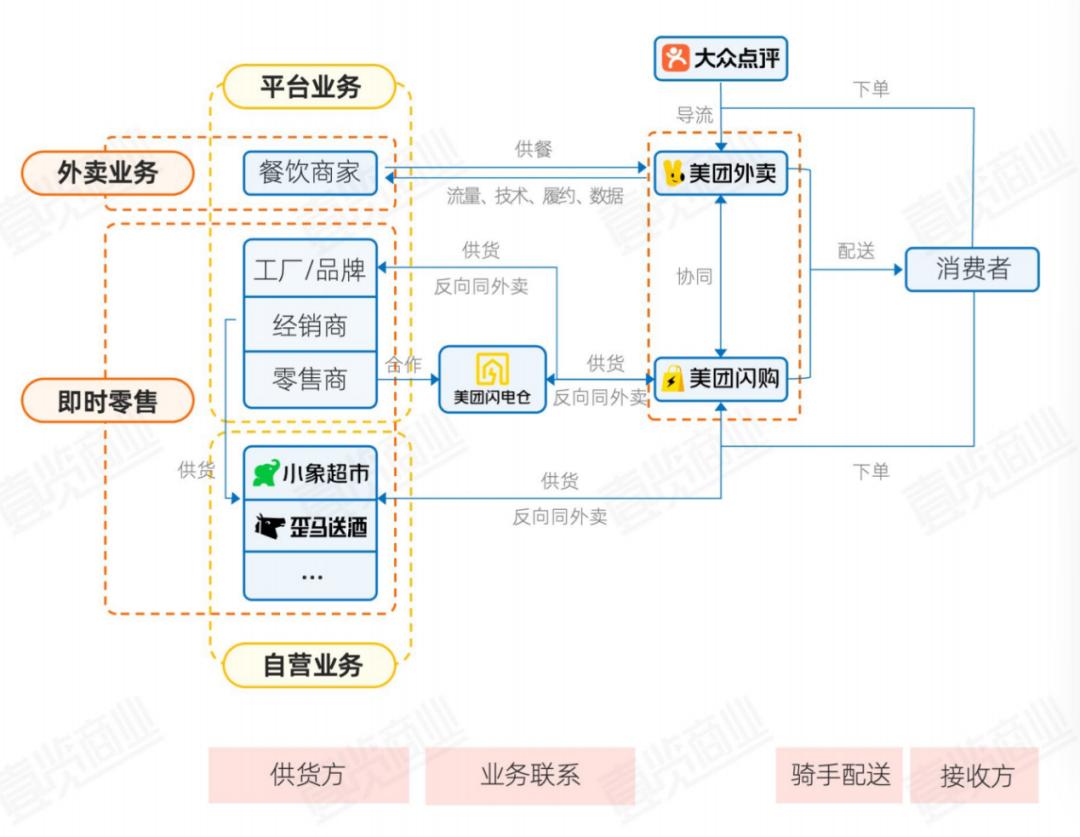 美團的“外賣+即時零售”模式中,商家端覆蓋多類市場主體,包括餐飲商家、工廠/品牌方、經銷商、零售商,以及美團自主運營的品牌。