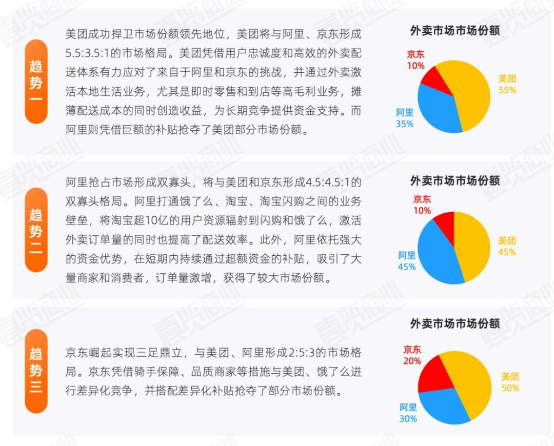 在阿里投入500億且不繼續(xù)追加額度的情況下,本輪外賣戰(zhàn)或將于雙11左右結束,我們對下半年外賣市場格局做出以下三種預測: