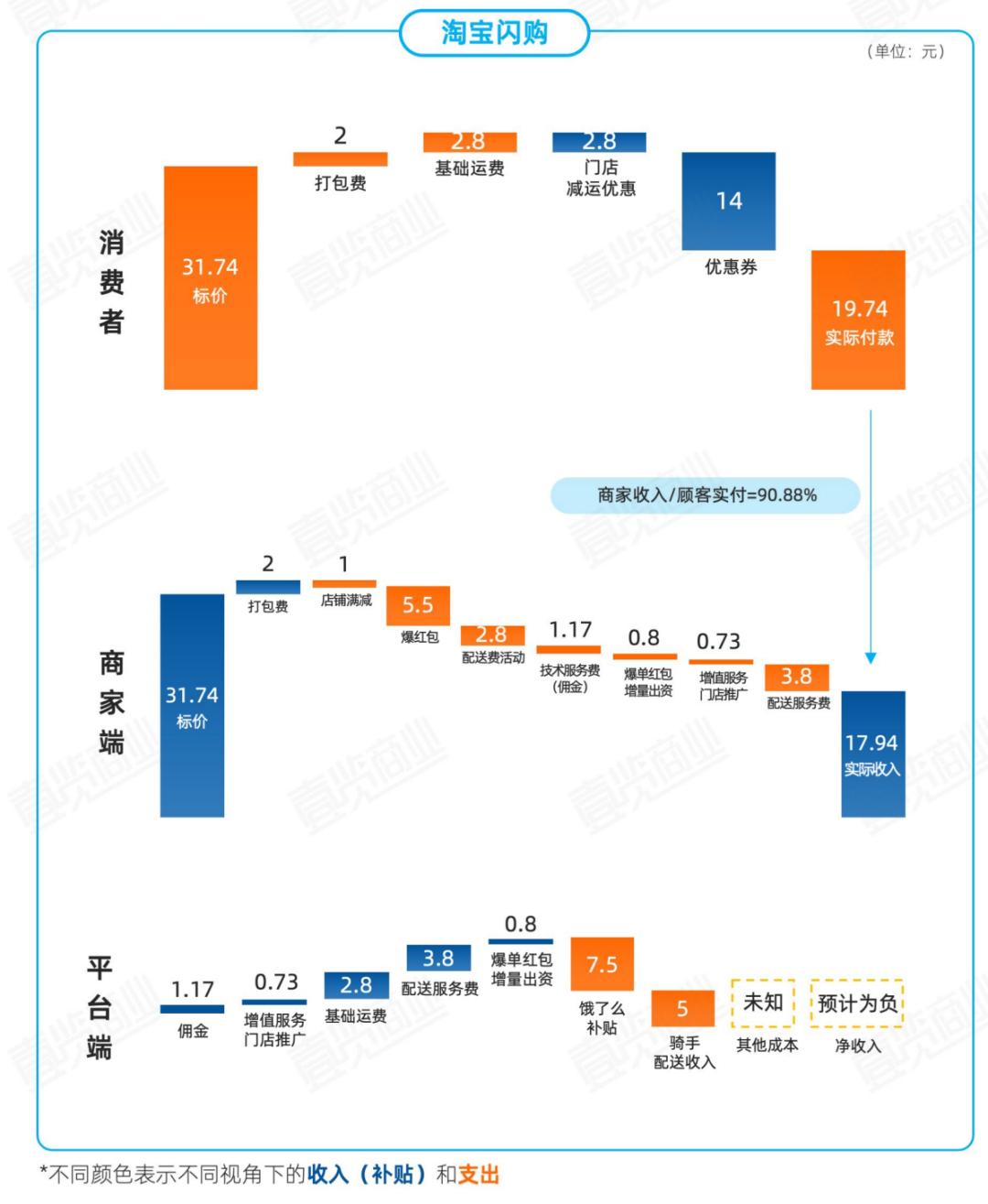從商家端看,美團平臺商家獲得的實際收入最高,京東次之,淘寶閃購最低。但是商家端在京東平臺獲取的收入甚至超過了消費者所支付的價格,反映出京東對平臺商家的支持;