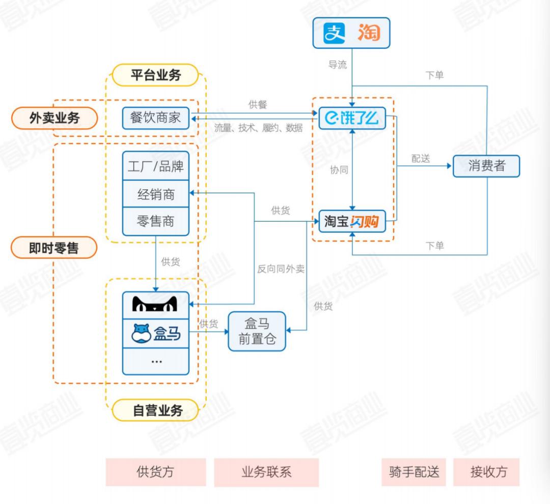 阿里的“外賣+即時零售”模式中,與美團的不同在于自營業(yè)務盒馬生鮮配有前置倉擴大服務范圍。另外,餓了么不僅自身打通了與閃購的聯(lián)系,支付寶和淘寶首頁也可以直接進入閃購和餓了么模塊,將即時支付和電商平臺的用戶導入外賣業(yè)務和即時零售。