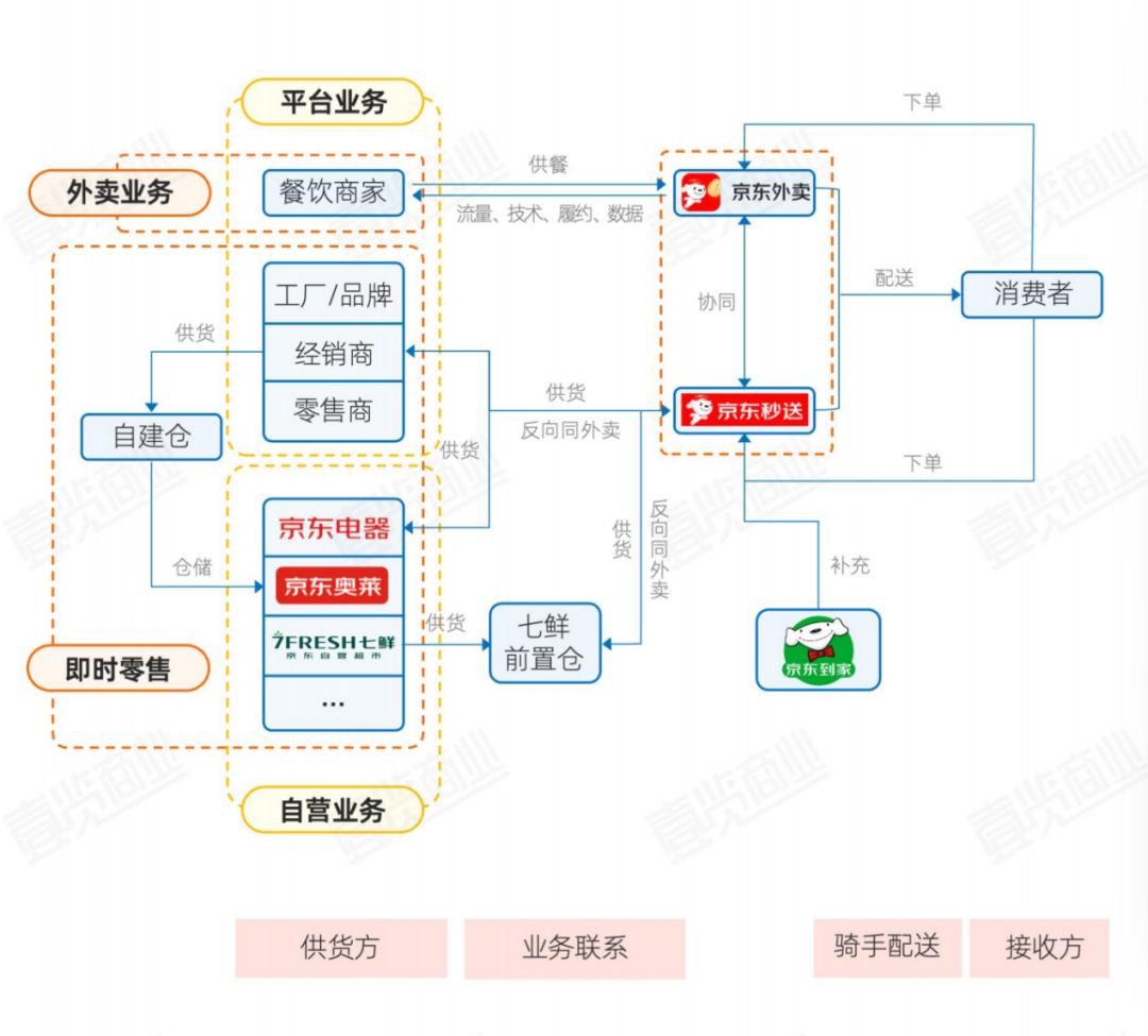 京東模式與美團模式不同的地方有:第一,自營業(yè)務的商品來源有一部分來自于自建倉,第二,自營業(yè)務中七鮮超市配有前置倉以提升服務范圍。京東app可以直接進入外賣和秒送模塊,同時還有京東到家作為即時零售業(yè)務的重要補充。