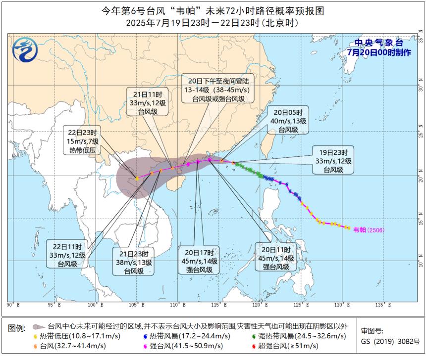 今年第6號臺風“韋帕”在19日23時從強熱帶風暴級增強為臺風級。其中心位置處于北緯21.5度、東經(jīng)116.7度,也就是在海南省文昌市東偏北方向約620公里的南海東北部海面上,中心附近最大風力達到12級(33米/秒)。預計“韋帕”會以每小時25公里左右的速度朝西偏北方向移動,強度逐步加強,朝著廣東珠海到海南文昌一帶沿??拷?,并會在20日下午至夜間在上述沿海登陸(風力13 - 14級,風速38 - 45米/秒,為臺風級或強臺風級)。之后穿過廣東雷州半島,21日白天進入北部灣海面,隨后朝著越南北部沿海移動。