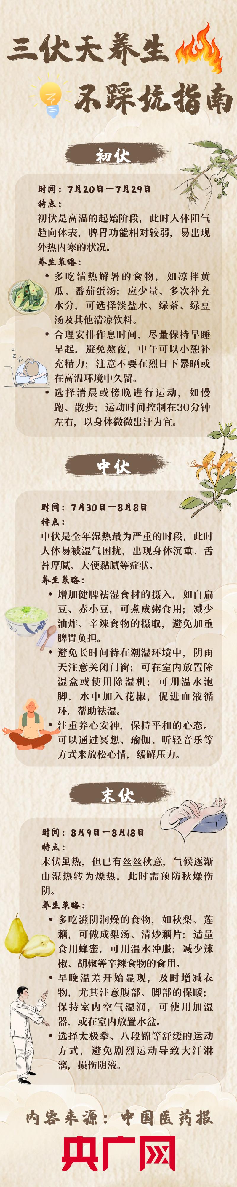 今年三伏天從7月20日開始,到8月18日結(jié)束。要知道,三伏分為初伏、中伏、末伏三個(gè)階段,每個(gè)階段的氣候特點(diǎn)和調(diào)養(yǎng)重點(diǎn)都不一樣。那怎樣科學(xué)地制定分階段的養(yǎng)生方案呢?下面帶您一圖讀懂↓↓↓