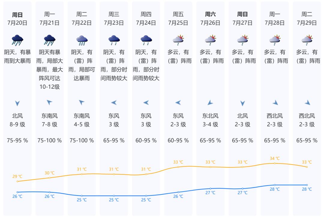7月20日,天氣是陰天,會有暴雨到大暴雨;氣溫在26℃ - 29℃;北風(fēng)8 - 9級;相對濕度75 - 95%。