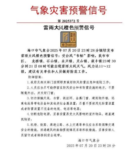 7月20日23時(shí)28分,??谑袣庀笈_(tái)繼續(xù)發(fā)布雷雨大風(fēng)橙色預(yù)警信號(hào)。