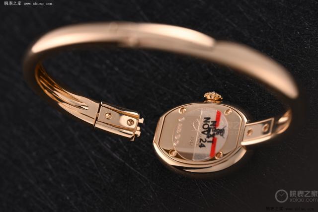 除首次使用表冠外,這只表還首次搭配硬質(zhì)手鐲式表帶,并直接與表殼連接。表帶材質(zhì)為 18k 金,開(kāi)關(guān)隱藏在與表殼銜接處,同時(shí)按壓兩個(gè)表扣即可打開(kāi),單手操作輕松無(wú)壓力。