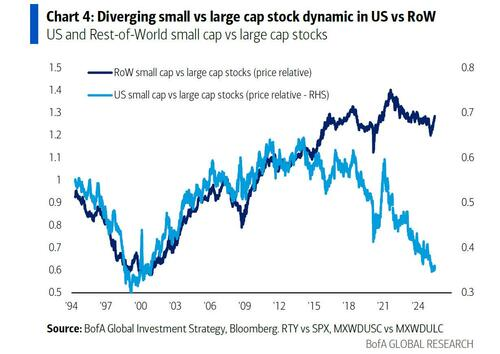 這種分化現(xiàn)象表明美國經(jīng)濟正在放緩或美股正處于泡沫狀態(tài)。相比之下,在市場情緒更為正常的全球股市中,價值股和小盤股表現(xiàn)優(yōu)于大盤股。