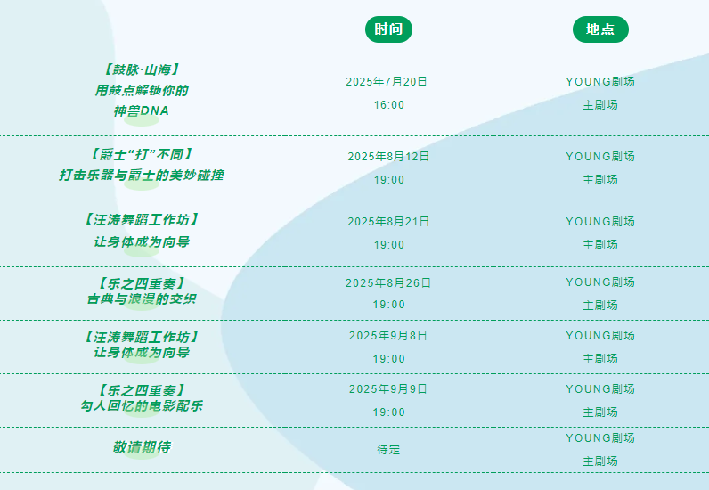 請收好這份“藝術(shù)納涼”時(shí)間表。據(jù)悉,本次“夏日納涼”系列演出活動(dòng)也是YOUNG劇場“美育Pro計(jì)劃”的一部分。該計(jì)劃自今年啟動(dòng)以來,圍繞“月月有大師”“月月有公益”“月月有開放”的主題策劃了眾多活動(dòng),以此實(shí)現(xiàn)劇場的社會(huì)效益和價(jià)值,提升城市公共文化服務(wù)品質(zhì)。