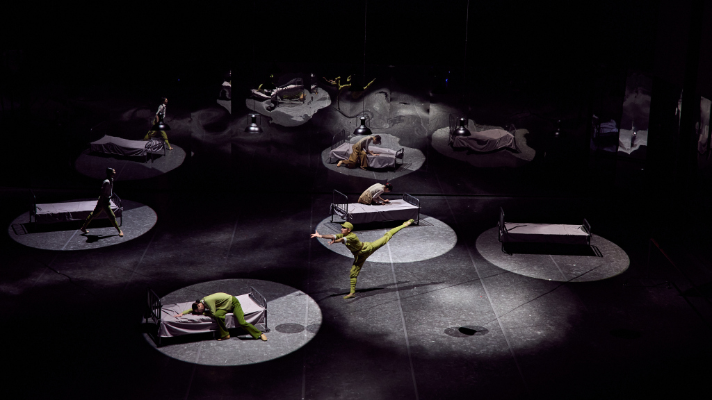 不過,從芭蕾舞美學(xué)看,有些細(xì)節(jié)值得商榷。如劇中最重要的象征——百合花被子,舞臺完全還原小說描寫,與整體舞臺風(fēng)格和演員服裝設(shè)計(jì)不協(xié)調(diào)。是否可將其處理成輕紗,成為年輕人的寫照?被子設(shè)計(jì)過于寫實(shí),三人圍繞被子起舞時(shí),可能讓觀眾費(fèi)解甚至誤解,破壞審美。