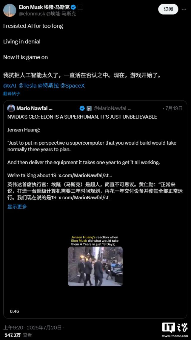 IT 之家 7 月 20 日消息,人工智能(AI)領(lǐng)域如今是各大科技巨頭和初創(chuàng)企業(yè)競爭的焦點(diǎn)。全球知名企業(yè)家埃隆?馬斯克近期明確表示,要全面投身人工智能發(fā)展浪潮。他創(chuàng)立的 AI 公司 xAI 已制定宏大發(fā)展計劃,有望在該領(lǐng)域成為主要競爭者之一。