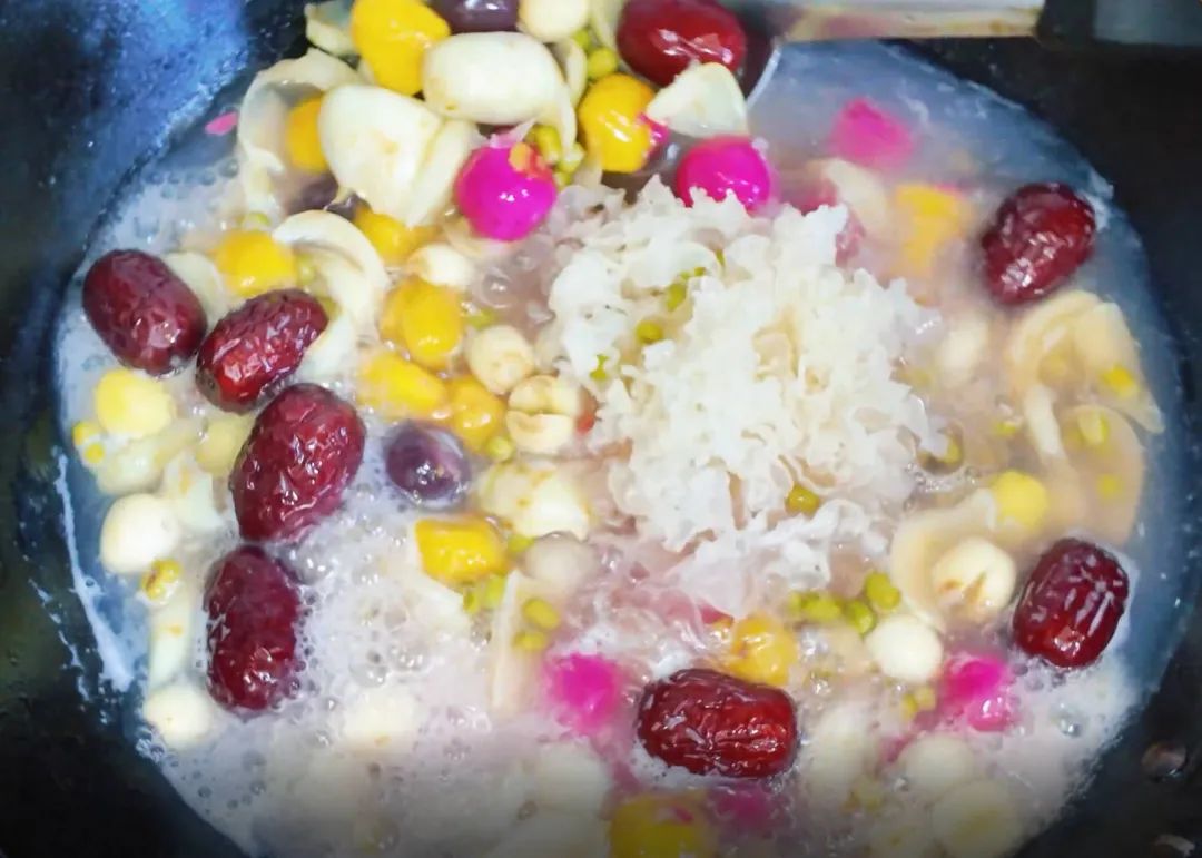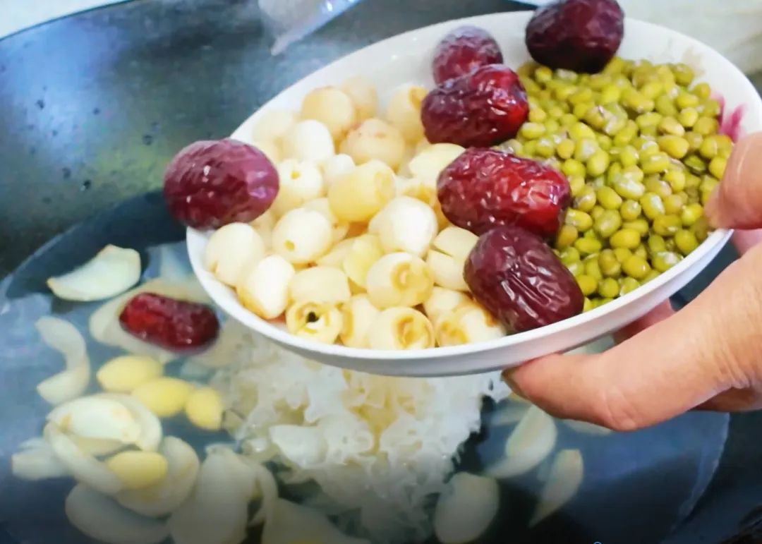 湯的材料:綠豆、蓮子、百合、銀耳、白果、紅棗、冰糖。