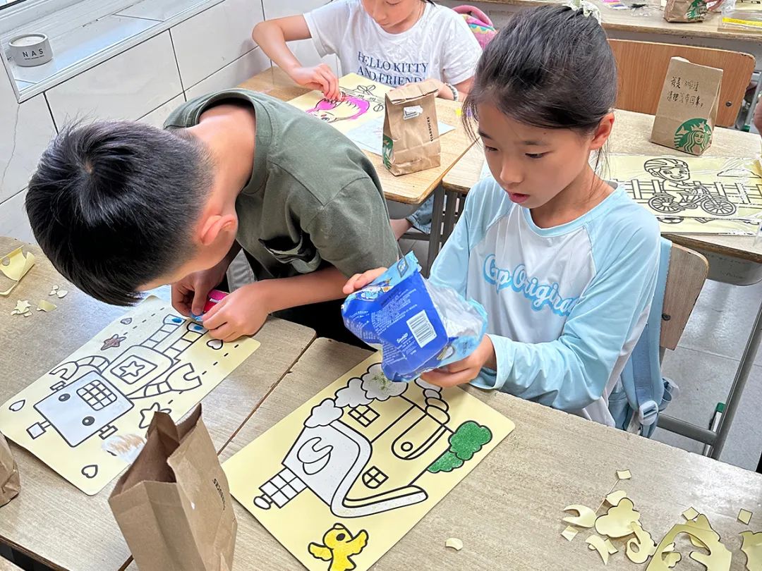廢棄的咖啡渣實現(xiàn)了“變廢為美”!將咖啡渣混入彩砂,孩子們用指尖勾勒出星空森林的模樣。獨特的肌理加上環(huán)保理念,創(chuàng)意無限!