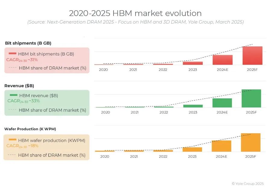 Yole還在報(bào)告中提到:“預(yù)計(jì)這一增長(zhǎng)勢(shì)頭將持續(xù)下去。HBM的增速遠(yuǎn)超整體DRAM市場(chǎng)。全球HBM收入預(yù)計(jì)將從2024年的170億美元增長(zhǎng)至2030年的980億美元,復(fù)合年增長(zhǎng)率達(dá)33%?!比蟠鎯?chǔ)巨頭最新的營(yíng)收數(shù)據(jù)也表明,HBM正沿著Yole預(yù)言的軌道發(fā)展。