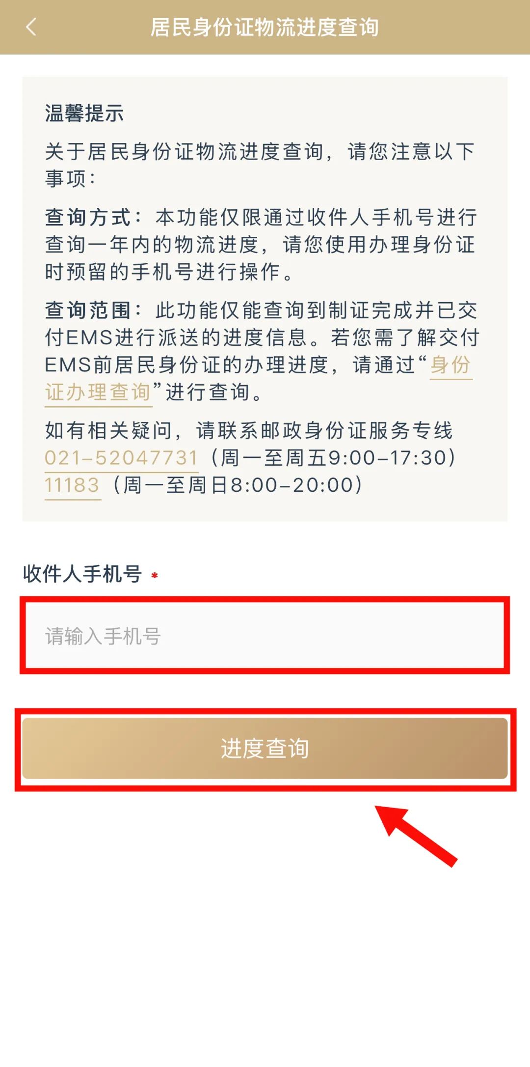 打開“隨申辦市民云”(App/微信小程序/支付寶小程序),在首頁搜索“居民身份證物流進度查詢”,進入后,輸入辦理身份證時提供的手機號碼,點擊“進度查詢”即可。