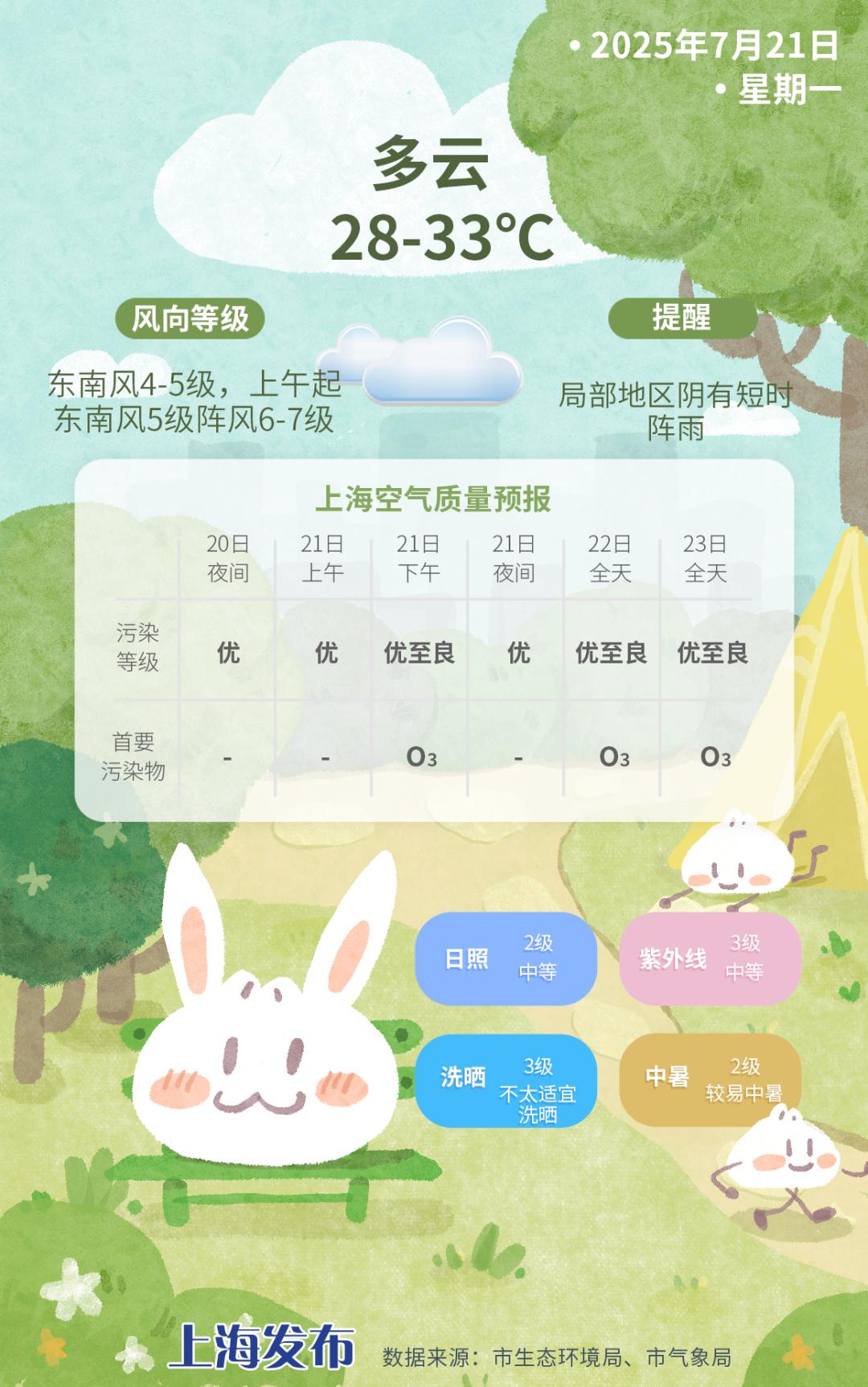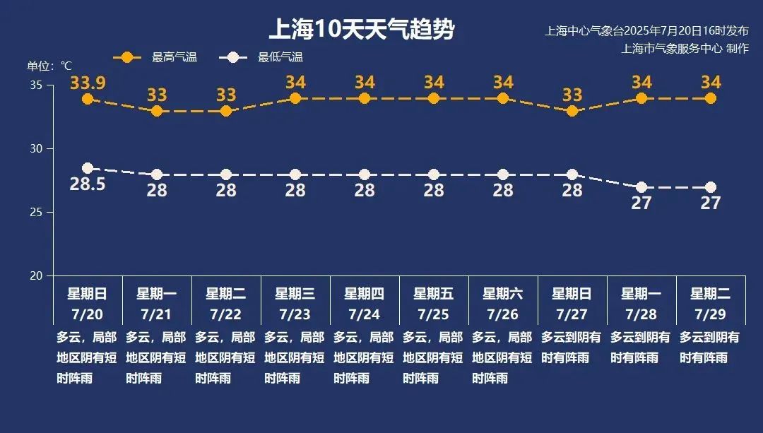 今年初伏期間,受東風(fēng)氣流影響,申城以多云天氣為主,局部地區(qū)多短時陣雨,風(fēng)力較大。最高氣溫預(yù)計在33 - 34℃,夜晚氣溫也不低,維持在28℃左右,大家仍需做好防暑降溫工作。