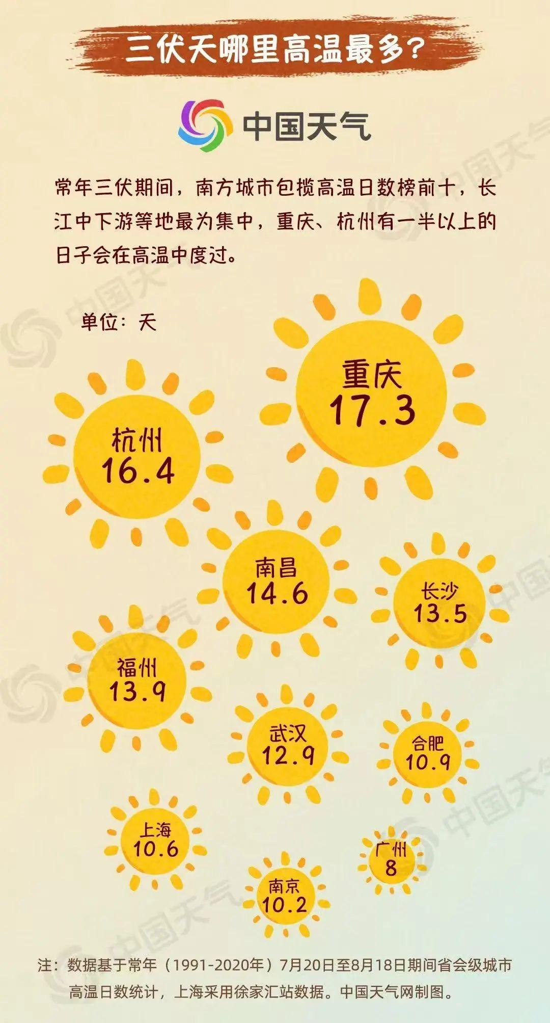 南方城市在高溫天數(shù)排行榜上占據(jù)前十,其中長江中下游等地高溫最為集中。上海常年平均有10.6天處于高溫狀態(tài)。