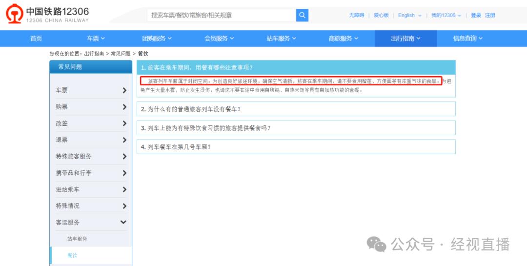 記者查詢12306官網(wǎng)發(fā)現(xiàn),旅客出行指南注意事項(xiàng)中明確指出,由于旅客列車(chē)車(chē)廂屬于封閉空間,為確保旅途環(huán)境良好和空氣清新,乘車(chē)期間請(qǐng)勿食用榴蓮、方便面等氣味濃重的食品。