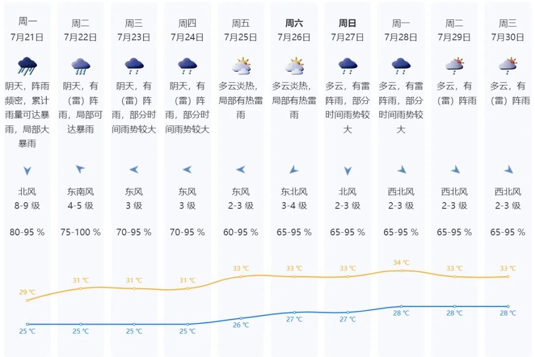 天氣方面,7月21日,陰天,陣雨頻密,累計(jì)雨量可達(dá)暴雨,局部大暴雨;氣溫25℃ - 29℃;北風(fēng)8 - 9級(jí);相對(duì)濕度80 - 95%。