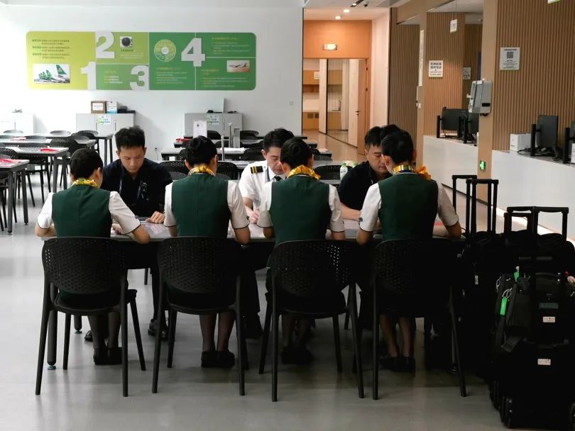 上午,記者在春秋航空總部辦公樓看到,正在進行航前簽到的女乘務員們都換下了高跟鞋,穿上了黑色的平底鞋?!按蠹液?,今天我們一起飛9C8865/9C8866,由上海虹橋飛新疆烏魯木齊,再返回上海虹橋?!背藙諉T們正為航班做著準備。