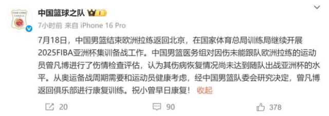 今日,中國籃球之隊(duì)官方在社媒公布了曾凡博近期情況,稱中國男籃醫(yī)務(wù)組對(duì)因傷未能跟隊(duì)歐洲拉練的運(yùn)動(dòng)員曾凡博進(jìn)行了傷情檢查評(píng)估,認(rèn)為其傷病恢復(fù)情況尚未達(dá)到隨隊(duì)出戰(zhàn)亞洲杯的水平。從奧運(yùn)備戰(zhàn)周期需要和運(yùn)動(dòng)員健康考慮,經(jīng)中國男籃隊(duì)委會(huì)研究決定,曾凡博返回俱樂部進(jìn)行康復(fù)訓(xùn)練。