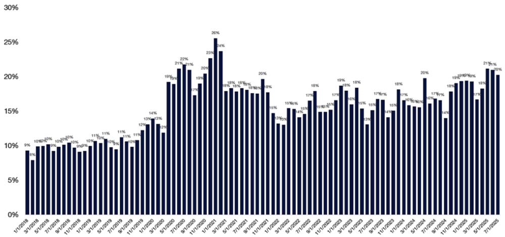 今年夏季市場(chǎng)反彈的背后,散戶成為推動(dòng)牛市的重要力量。數(shù)據(jù)顯示,2025年美國(guó)散戶通過(guò)股票與ETF已凈流入1550億美元,持股市值創(chuàng)歷史新高,約占美國(guó)家庭金融資產(chǎn)的49%,若包括401K等間接持倉(cāng),占比接近60%。投機(jī)型參與者的持續(xù)買入強(qiáng)化了市場(chǎng)“逢低買入”的習(xí)慣。