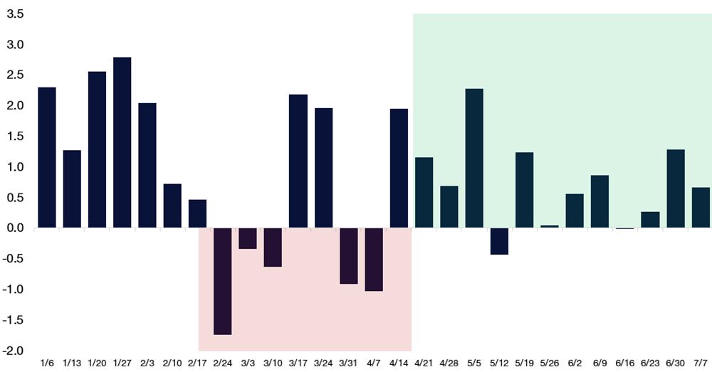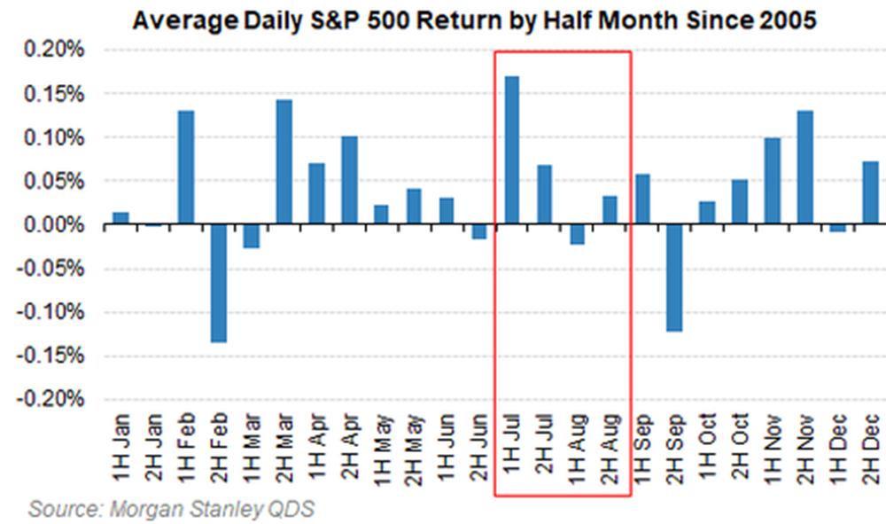 從季節(jié)性因素來(lái)看,7月對(duì)美國(guó)股票極為有利。自1928年以來(lái),7月是標(biāo)普500指數(shù)表現(xiàn)最佳的月份,而9月則表現(xiàn)最差,因?yàn)橥顿Y者要“返校”。標(biāo)普500指數(shù)有望在7月實(shí)現(xiàn)連續(xù)第11個(gè)月上漲。Citadel Securities的夏季交易活動(dòng)顯示股票需求大幅增加,而其他投資者此時(shí)往往遠(yuǎn)離交易終端。