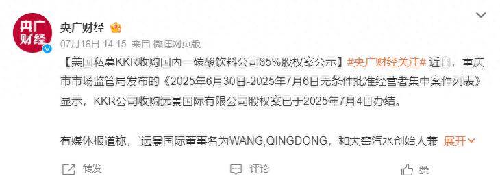 重慶市市場(chǎng)監(jiān)管局發(fā)布的《2025年6月30日 - 2025年7月6日無(wú)條件批準(zhǔn)經(jīng)營(yíng)者集中案件列表》顯示,KKR收購(gòu)遠(yuǎn)景國(guó)際股權(quán)案已于2025年7月4日辦結(jié)。