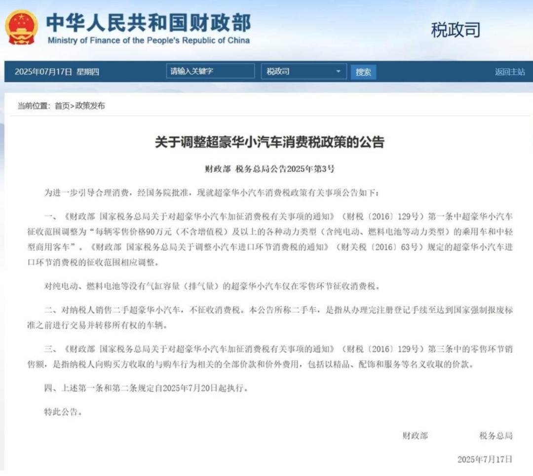 前幾天,財政部和稅務(wù)總局聯(lián)合發(fā)布了調(diào)整超豪華小汽車消費稅收政策的公告,核心內(nèi)容是下調(diào)了超豪華車消費稅起征點。
