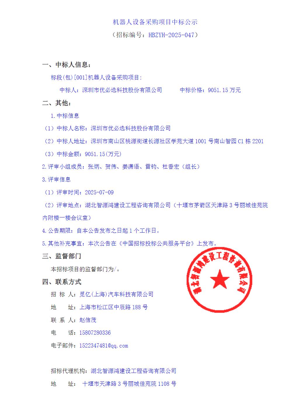 智東西7月21日消息,近日,從中國招標(biāo)投標(biāo)公共服務(wù)平臺(tái)可知,優(yōu)必選成功中標(biāo)覓億(上海)汽車科技有限公司價(jià)值9051.15萬元的機(jī)器人設(shè)備采購項(xiàng)目。截至目前,這不僅是優(yōu)必選中標(biāo)金額最大的項(xiàng)目,也是全球人形機(jī)器人企業(yè)中標(biāo)金額最大的訂單。