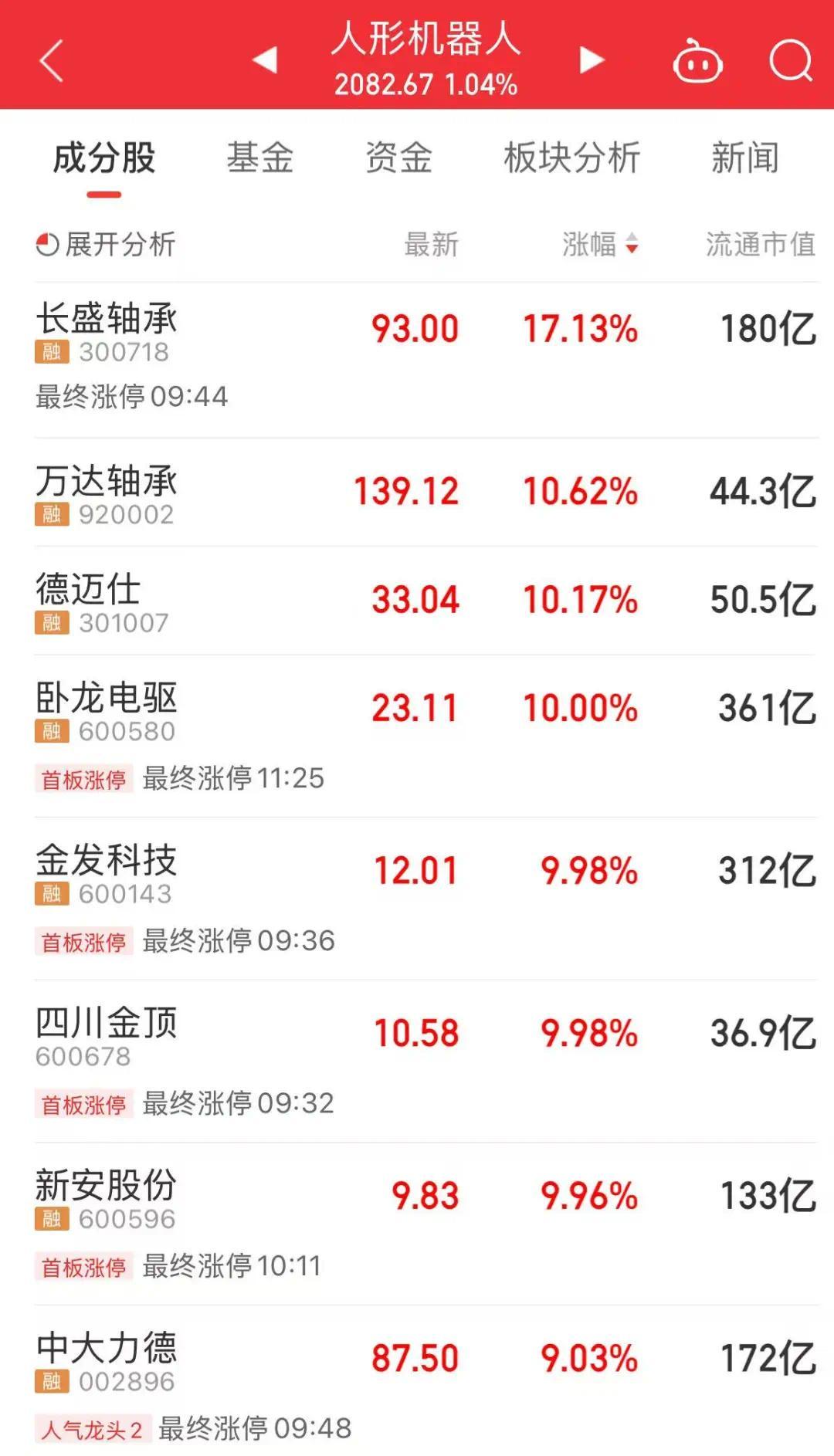 今日上午,人形機(jī)器人板塊呈現(xiàn)上漲態(tài)勢(shì),長盛軸承、萬達(dá)軸承等個(gè)股漲幅較大。