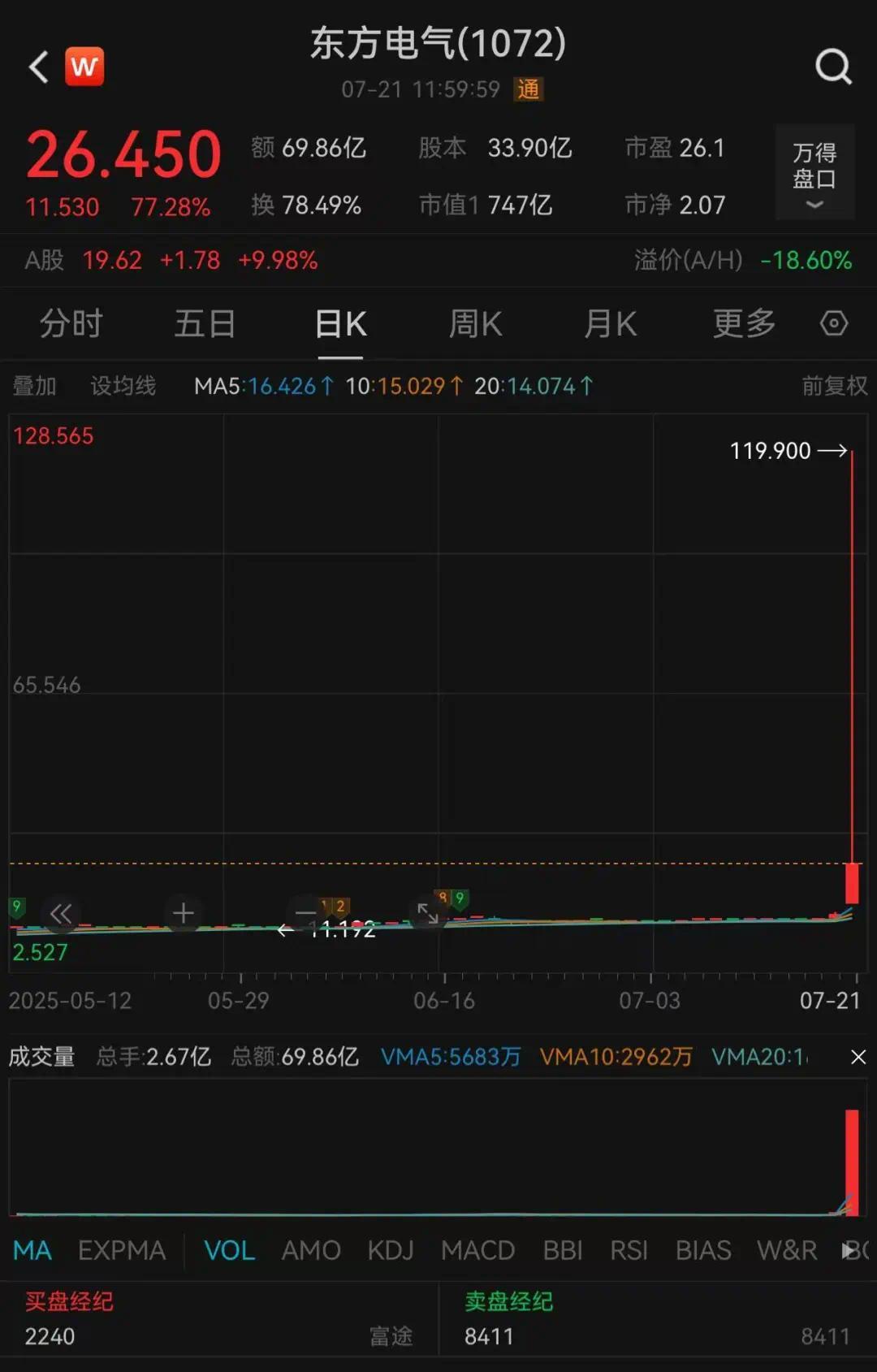 今日上午,東方電氣A股“一字”漲停,其H股開盤價(jià)為17.14港元,開盤后股價(jià)瞬間飆升至119.9港元,漲幅超過700%,隨后又快速回落。這一異常走勢(shì)引發(fā)了市場(chǎng)的廣泛熱議,不少網(wǎng)友猜測(cè)可能是烏龍指所致。