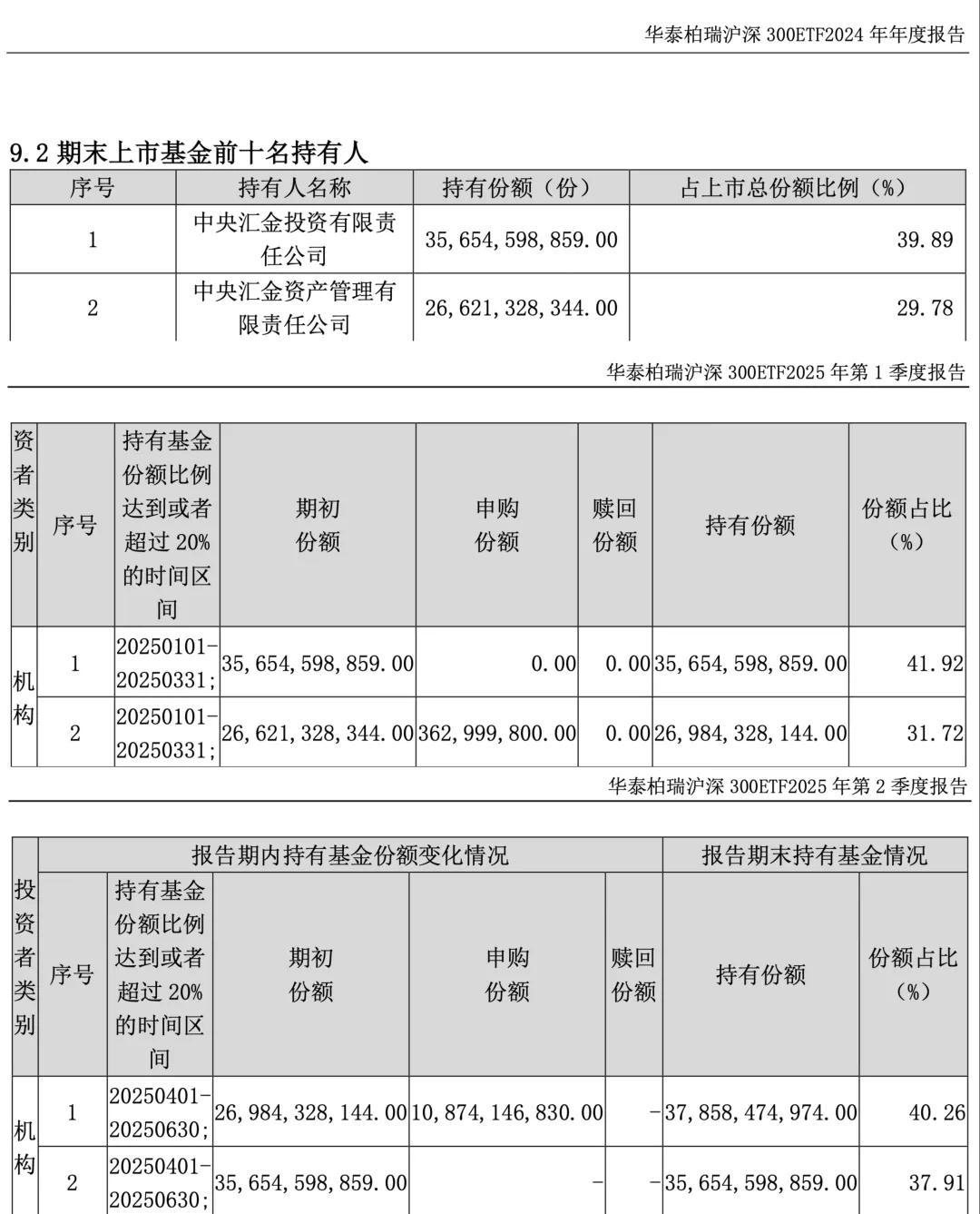 翻閱2024年基金年報(bào)可以發(fā)現(xiàn),中央?yún)R金資產(chǎn)管理有限責(zé)任公司期末持有266.21億份該ETF,中央?yún)R金投資有限責(zé)任公司持有356.55億份該ETF。由此可以推斷,二季報(bào)中“機(jī)構(gòu)1”即為中央?yún)R金資產(chǎn)管理有限責(zé)任公司,“機(jī)構(gòu)2”即為中央?yún)R金投資有限責(zé)任公司。